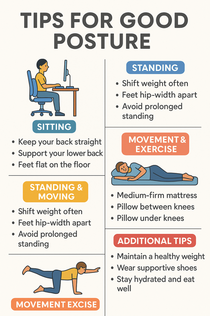 רשימת טיפים מעשיים ליציבה נכונה שיכולים להקל ולמנוע החמרה בכאבי גב תחתון – מותאם לשימוש יומיומי בבית, בעבודה ובפעילות גופנית.