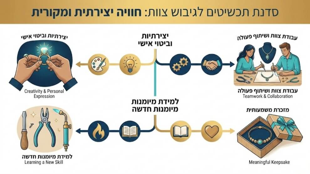 סדנת תכשיטים היא סדנת גיבוש צוות ייחודית משום שהיא משלבת יצירתיות אישית עם תוצר פיזי ומוחשי המהווה זיכרון מתמיד לחוויה הקבוצתית. בניגוד לפעילויות גיבוש סטנדרטיות, היא מאפשרת לכל עובד להביא לידי ביטוי את הסגנון הייחודי שלו תוך כדי עבודה משותפת בחלל...