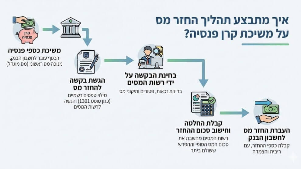 הזכות להחזר מס על משיכת כספי פנסיה לפני המועד החוקי מתממשת באמצעות הגשת דוח שנתי למס הכנסה (טופס 1301) או בקשה להחזר מס (טופס 135), המגובים באסמכתאות על המשיכה ועל גובה ההכנסות השנתי. התהליך מאפשר לקבל בחזרה חלק מהמס בשיעור 35% שנוכה במקור, במידה...