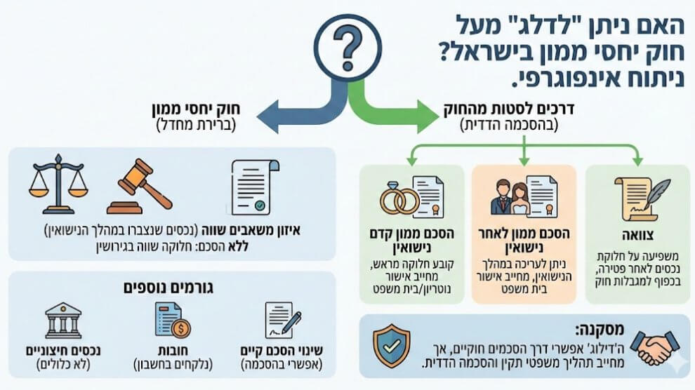 ניתן “לדלג” מעל הוראות חוק יחסי ממון בין בני זוג, התשל”ג-1973, אך ורק באמצעות עריכת הסכם ממון בכתב ואישורו כדין על ידי ערכאה מוסמכת (בית משפט לענייני משפחה או בית דין דתי). ללא הסכם כזה, יחול באופן אוטומטי “הסדר האיזון”...