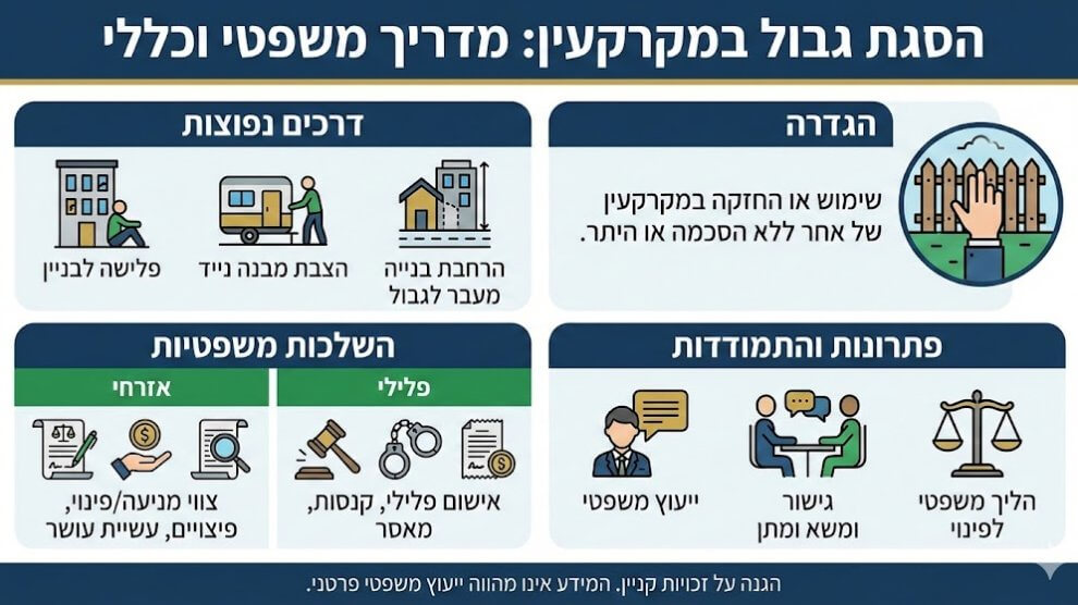 החלטנו שהגיע הזמן לגלות לכם דברים שלא ידעתם על המורכבות המשפטית והרגשית של הגנה על הקרקע שלכם. הסגת גבול במקרקעין היא מצב שבו אדם חודר למקרקעין של אחר, מחזיק בהם או נכנס אליהם שלא כדין, וזוהי אחת העוולות המורכבות ביותר בפקודת הנזיקין ובחוק המקרקעין...