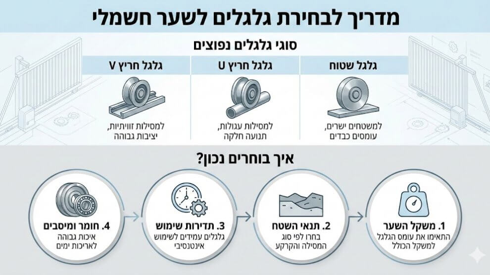 בחירת גלגלים לשער חשמלי מתבססת על שלושה פרמטרים קריטיים: משקל השער, סוג המסילה (עגולה או זוויתית) ותנאי הסביבה. כדי להבטיח פעולה חלקה ואורך חיים למנוע, יש להשתמש בגלגלים בעלי כושר נשיאה הגבוה ב-20% לפחות ממשקל השער בפועל, תוך העדפת גלגלים עם מיסבים...
